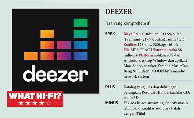 Namun, Deezer memiliki satu kartu as: trek 360 Reality Audio. Format imersifnya sedikit mirip dengan Dolby Atmos, tetapi khusus untuk musik streaming. Ini adalah bonus bagus tapi hanya tersedia untuk pelanggan layanan Premium £11,99 Deezer. Deezer adalah layanan streaming musik pertama yang menawarkan 360 Reality Audio, dimana sejak itu telah bergabung dengan yang lain termasuk Tidal dan Amazon Music HD, membuatnya tidak lagi menjadi penawaran yang unik.